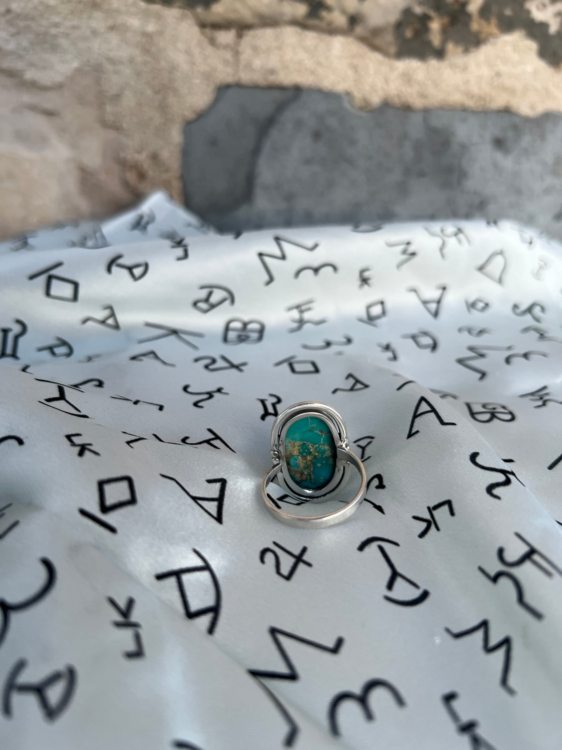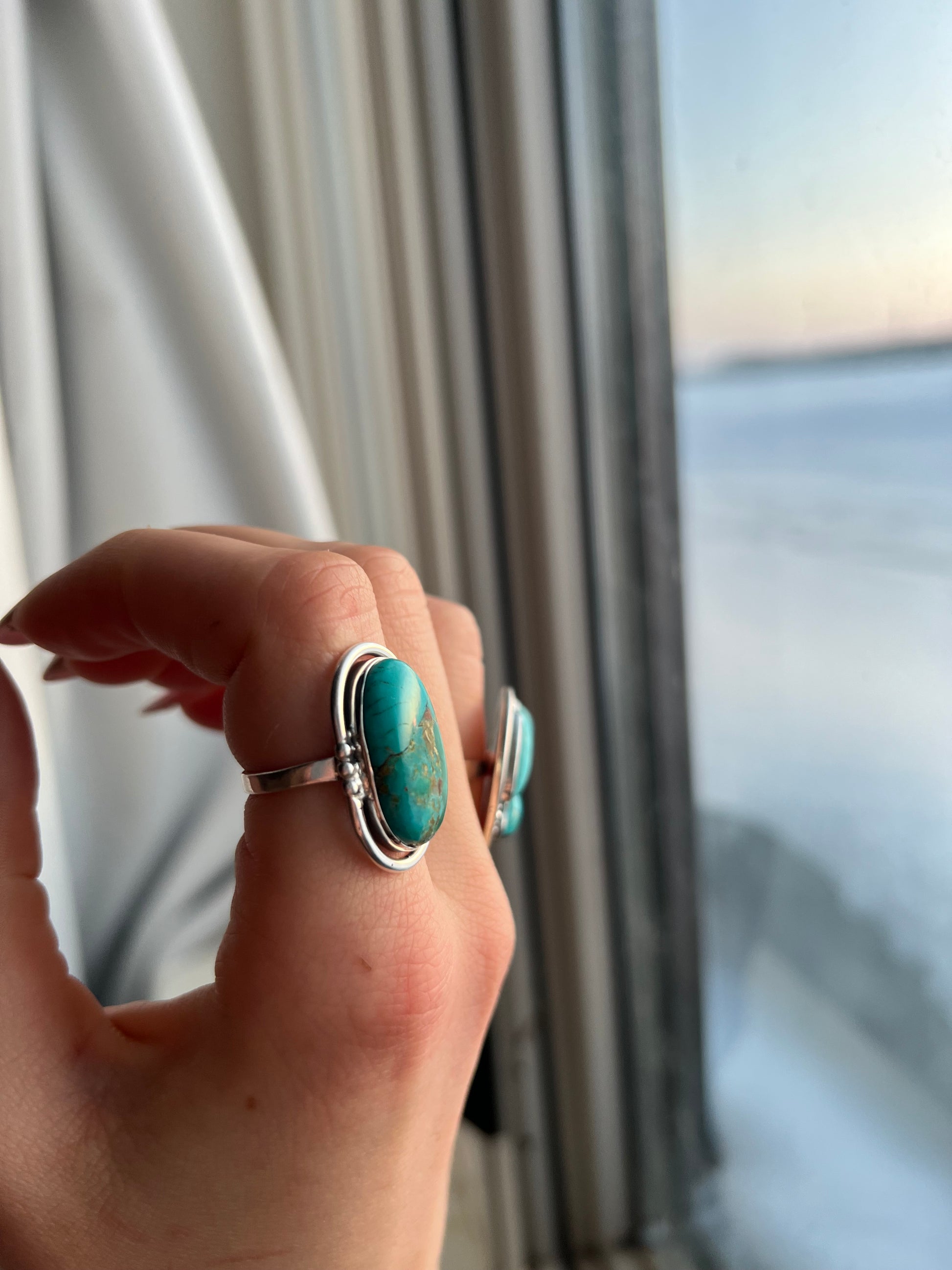 A bold, adjustable sterling silver ring featuring a vibrant turquoise stone with natural matrix. Set in a classic bezel, this piece has timeless western character and is made to be worn comfortably on multiple fingers.