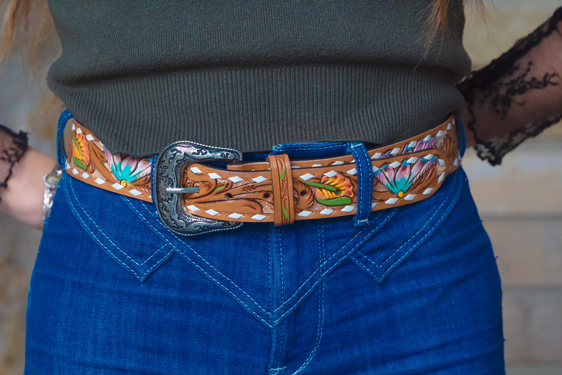 Beautifully crafted brown leather belt featuring white buckstitch detailing and vibrant floral tooling throughout. Finished with a silver tooled buckle that adds the perfect touch. A statement piece that pairs effortlessly with jeans or a favourite dress.