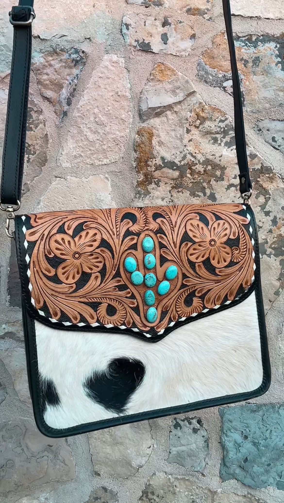 The Cactus Creek Crossbody – A true showstopper and one of our personal favorites. Coming in either black OR brown, the magnetic button flap showcases rich tooled leather on a black or brown backdrop, adorned with nine hand-set turquoise stones forming a striking cactus design. Behind it, genuine hair-on cowhide adds depth and western charm, framed by 2 sturdy metal hoops for the detachable, adjustable strap. Inside, you’ll find a roomy open compartment with a secure zipper pocket, while the back features smooth genuine leather and an extra zipper compartment for easy-access essentials.